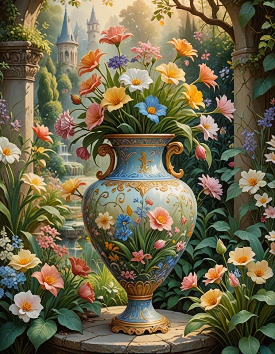 This enchanting digital painting depicts a delicate porcelain vase in a lush vintage fantasy garden, surrounded by misty sunlight, golden accents, and soft pastel tones, evoking a dreamy and imaginative atmosphere.