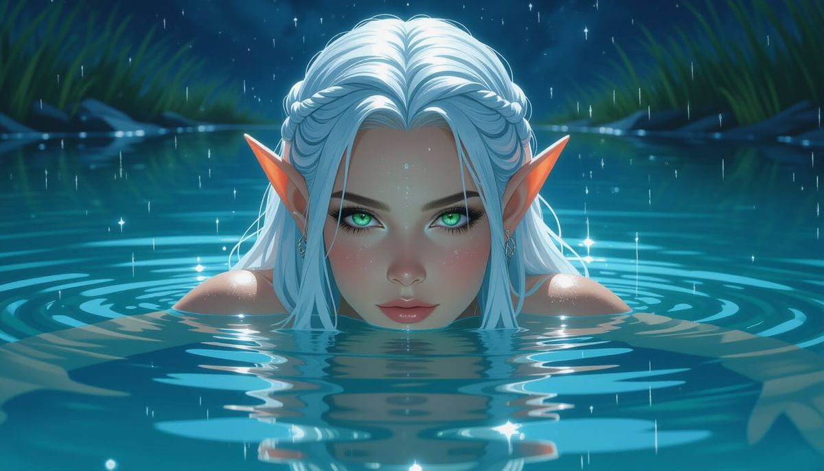 This image shows an elf woman with silver hair and emerald eyes swimming in a lake at night. The photorealistic image captures the serene scene with subtle lighting.