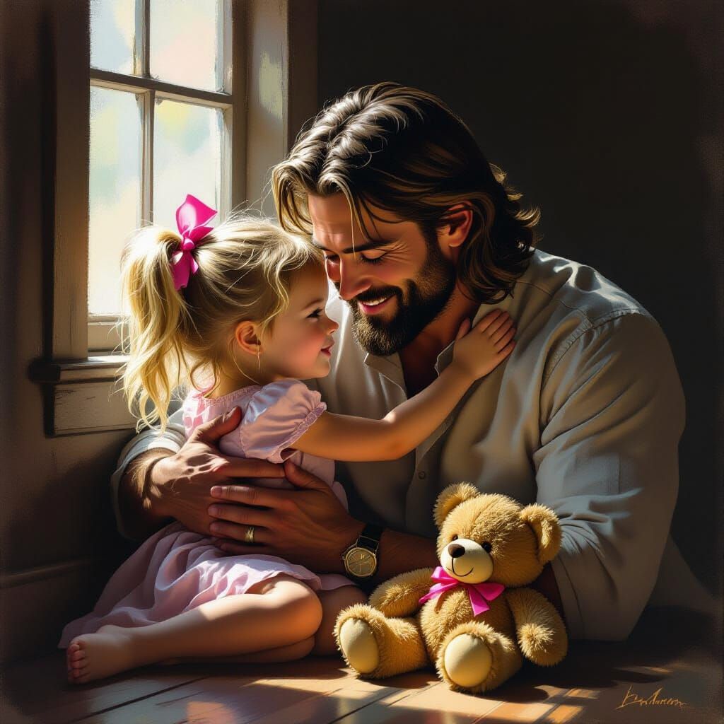 A touching scene of a father and daughter sharing a warm embrace, captured with dramatic lighting and a soft, painterly style focusing on emotional storytelling.
