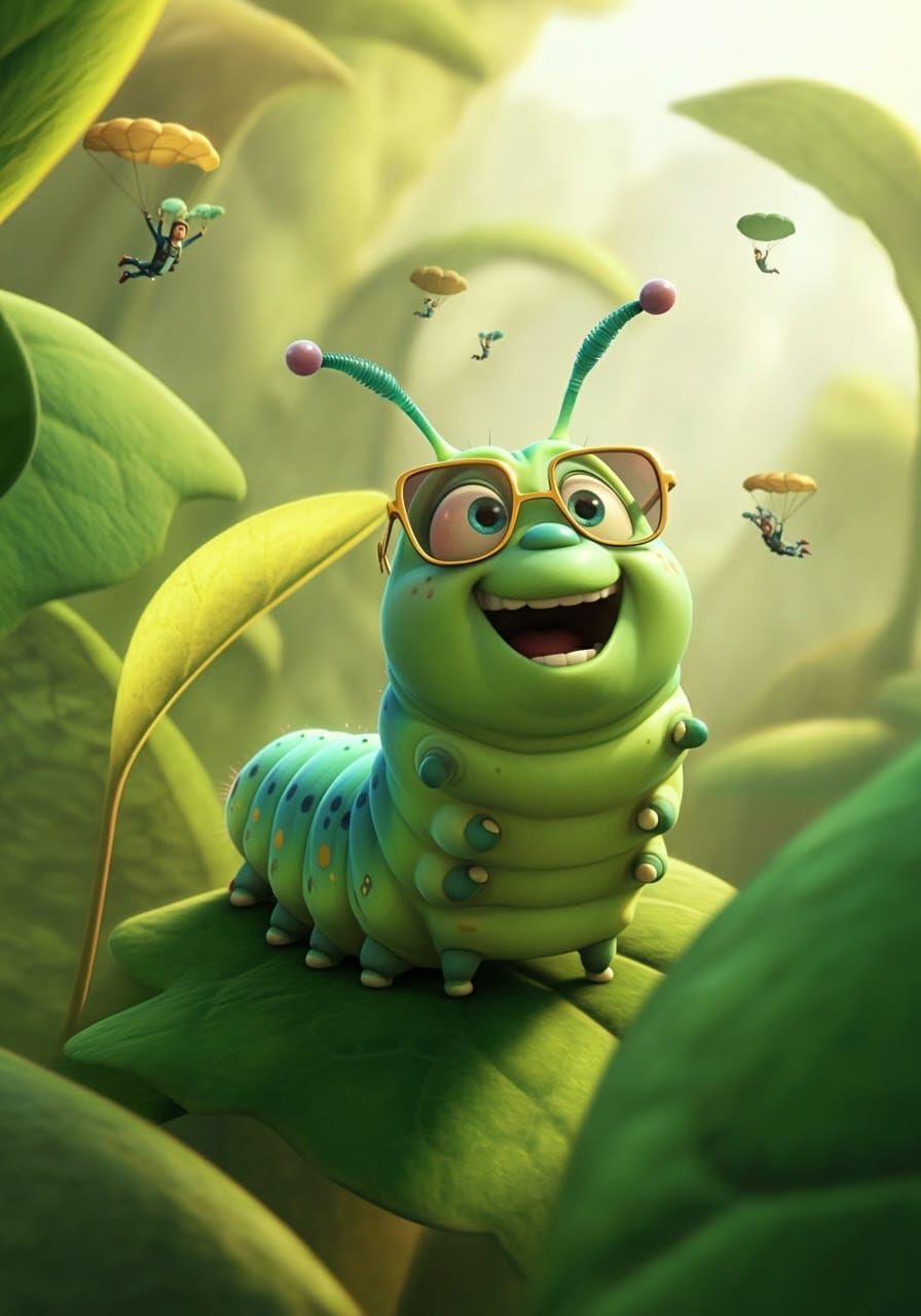 A vibrant image of a caterpillar wearing sunglasses and grinning while watching skydivers. The scene is set among lush, green vegetation in a Pixar-inspired animation style.