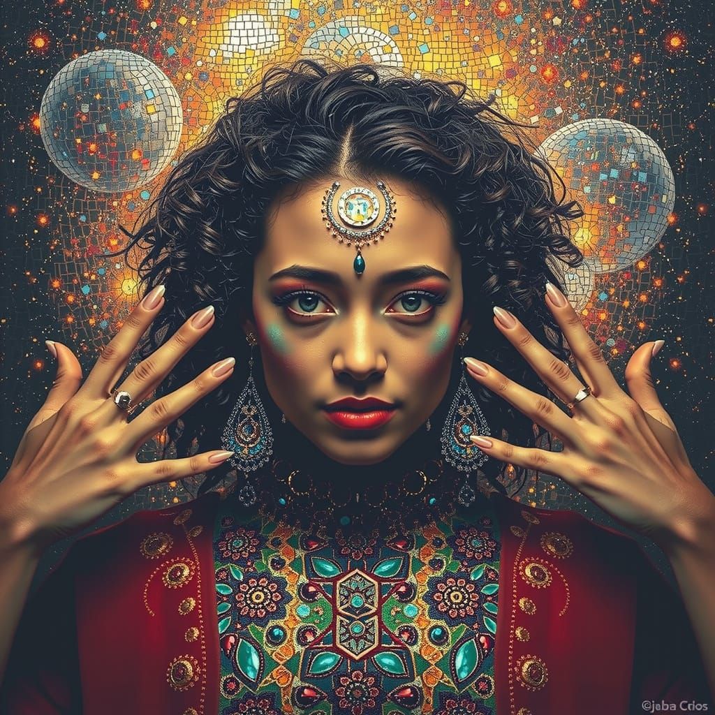 This image shows a mosaic artwork of a photorealistic woman with iridescent colors rippling across her skin, set against a starry night sky. The scene is rendered with maximalist detail and avant-garde flair.