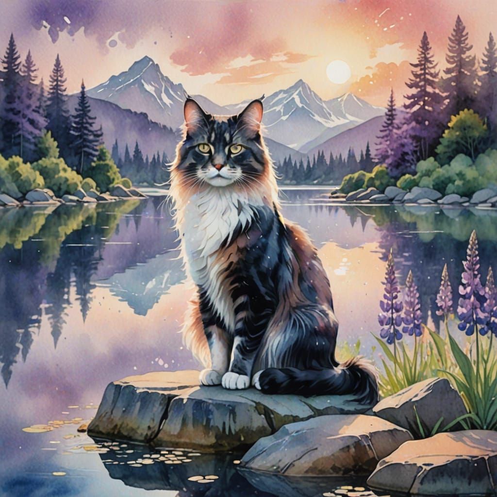 A whimsical watercolor of an elegant cat sitting on a rock. The image features a double exposure effect, soft pastel colors, and glowing lupins, creating a dreamy, ethereal landscape.
