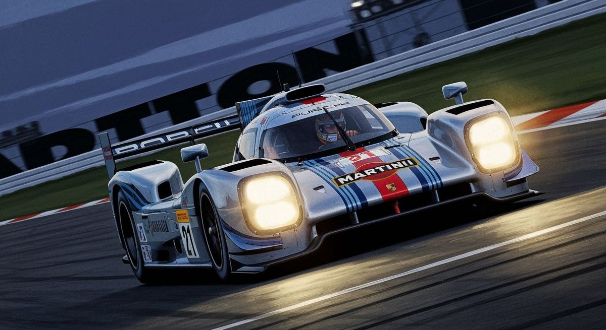 A retro 70s magazine illustration of a Porsche 919 LMP1 race car in Martini livery speeding on a Daytona curve at twilight, headlights blazing.