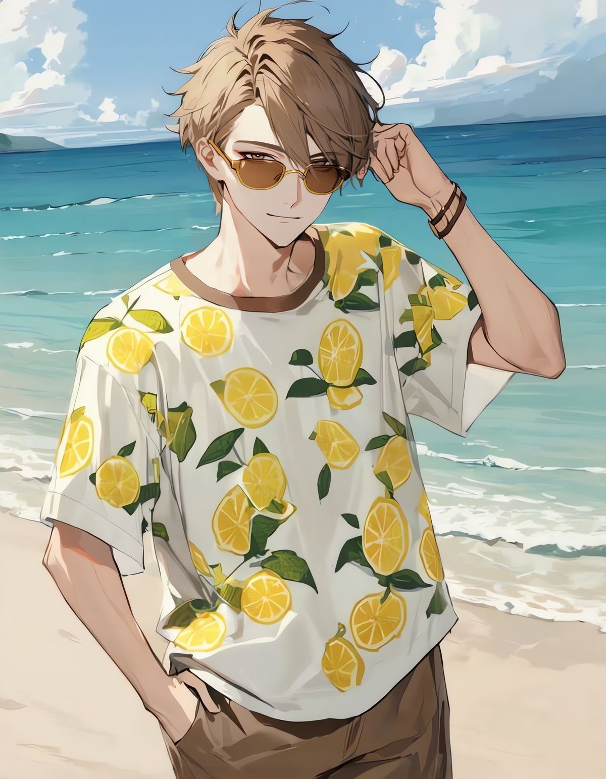 This image features a bishounen with short brown hair and yellow sunglasses, wearing a lemon-print t-shirt and shorts. He stands casually on a sunny beach with the sea in the background.