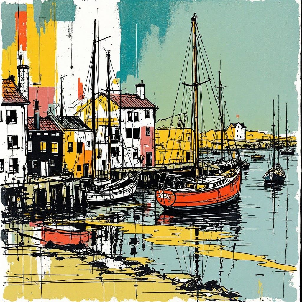 This expressive painting captures the essence of a harbor in Maine, with confident ink lines and vibrant color blocks creating a sense of depth and visual tension. The artist's gestural style blends controlled precision with deliberate chaos, adding emotional impact to the scene.