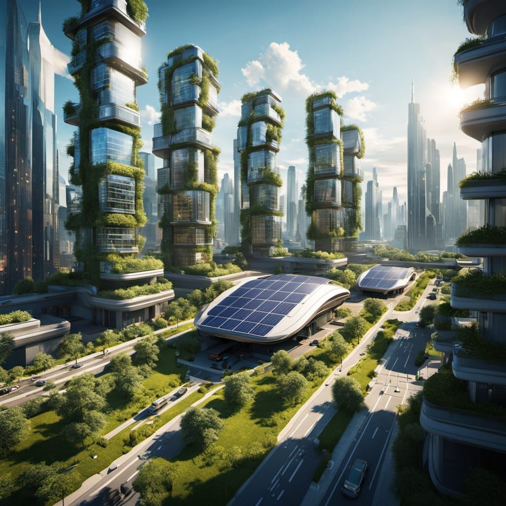 This image showcases a modern city where innovation meets nature, featuring lush green roofs, sleek glass skyscrapers, and solar-powered vehicles in a vibrant residential area filled with greenery and surrounded by a cinematic urban landscape.