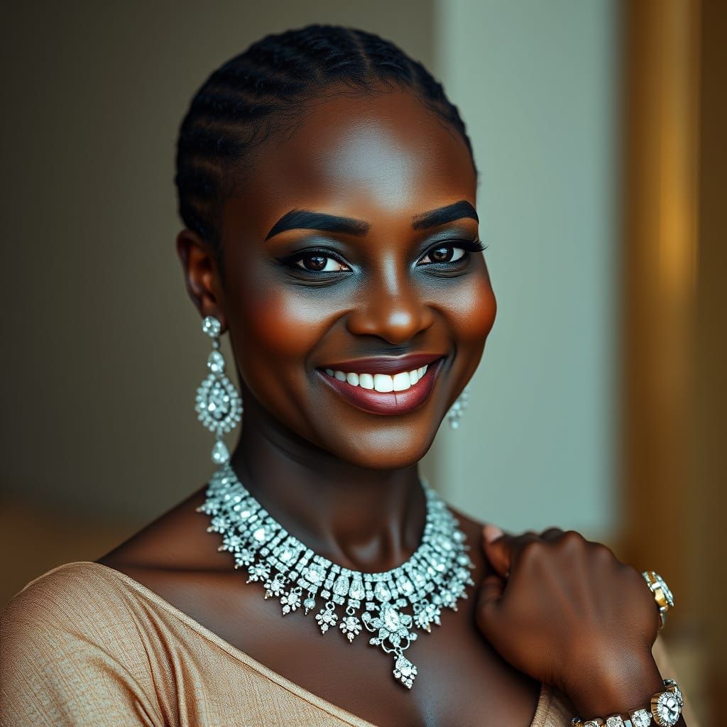 This image depicts a stunning dark-skinned woman adorned with exquisite Cartier-style jewellery, featuring intricate designs and sparkling diamonds, set against a subtle backdrop, reminiscent of high-fashion photography with lifelike textures and precise lighting.