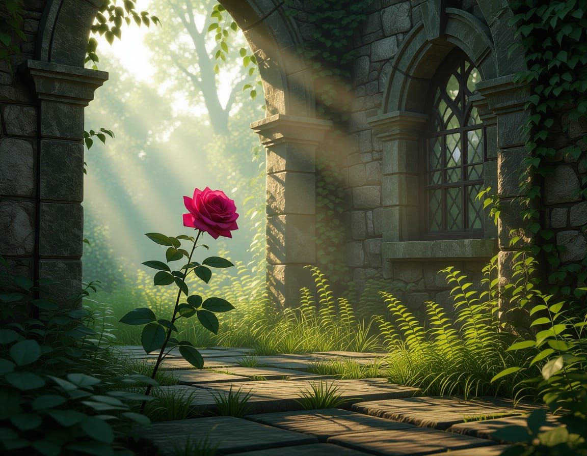 This image showcases a single dew-kissed rose thriving in an overgrown garden of a crumbling manor. Sunlight creates dappled patterns, highlighting nature's reclamation in a concept art style with rich textures and atmospheric lighting.
