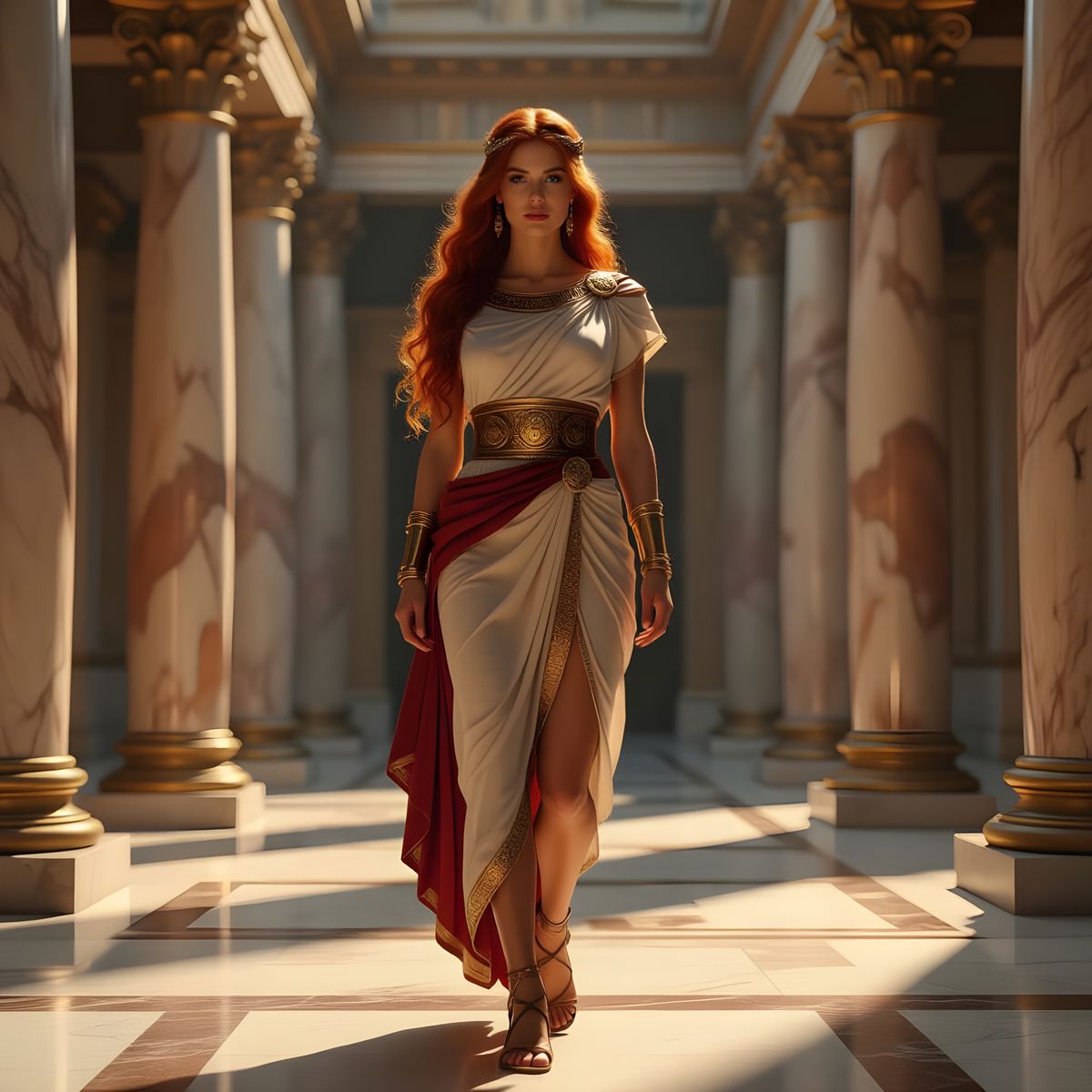 A striking image of a red-haired woman in a Roman toga and sandals, standing within an ancient temple. Captured from a low angle with a cinematic matte finish.