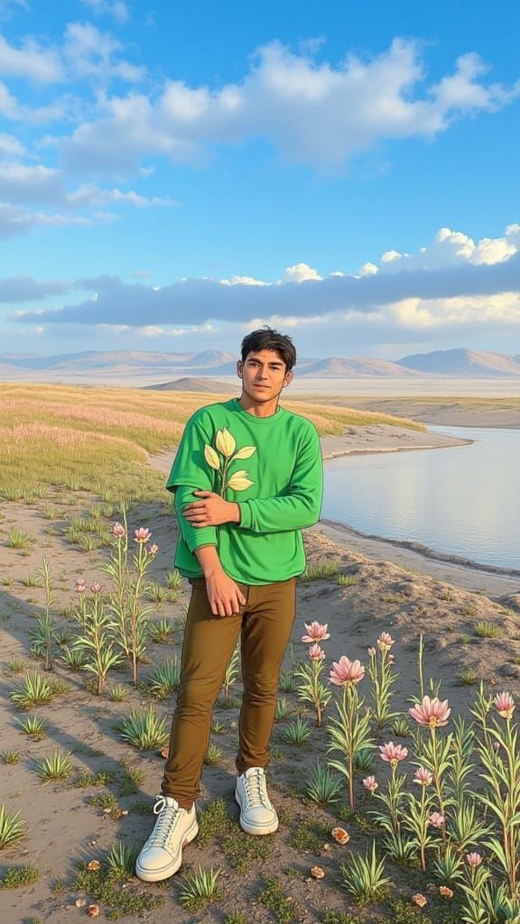 This serene landscape painting features a man standing in a lush meadow, surrounded by stylized flowers and a breathtaking blue and pink sky with a shimmering lake, evoking the style of Studio Ghibli with dreamy, watercolor textures and fantastical elements.