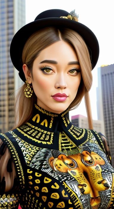 A striking portrait of a woman in an animal cracker dress, set against a downtown Los Angeles backdrop. The image emphasizes symmetry and detailed, proportional features, in an absurdist style.