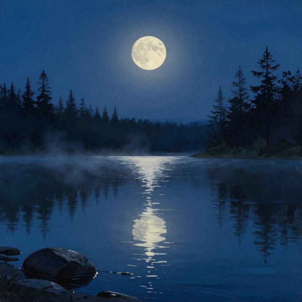 This image depicts a tranquil night scene with a perfectly still lake reflecting a bright moon. Dark pines and smooth rocks line the shore, with faint mist adding to the quiet atmosphere. Rendered in a stylized watercolor-gouache technique.