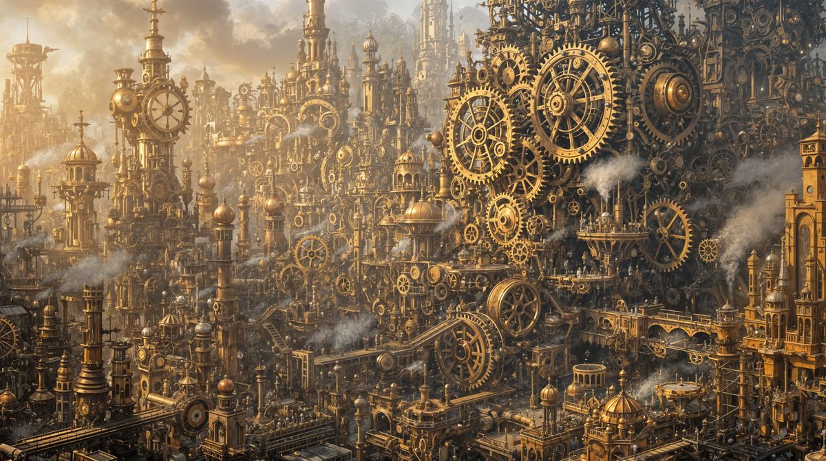 This digital painting depicts a vast, intricate cityscape of interconnected gears, cogs, and clockwork mechanisms in motion, set against a backdrop of warm, artificial light and natural light, with a focus on metallic colors and steam and smoke effects.