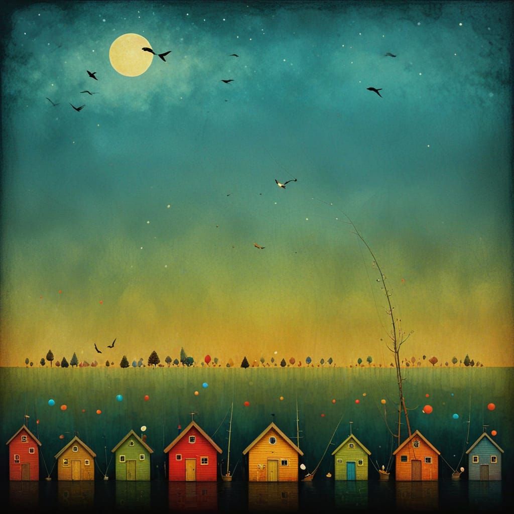 This image depicts a whimsical fishing village with brightly colored huts, reminiscent of a charming seaside scene.