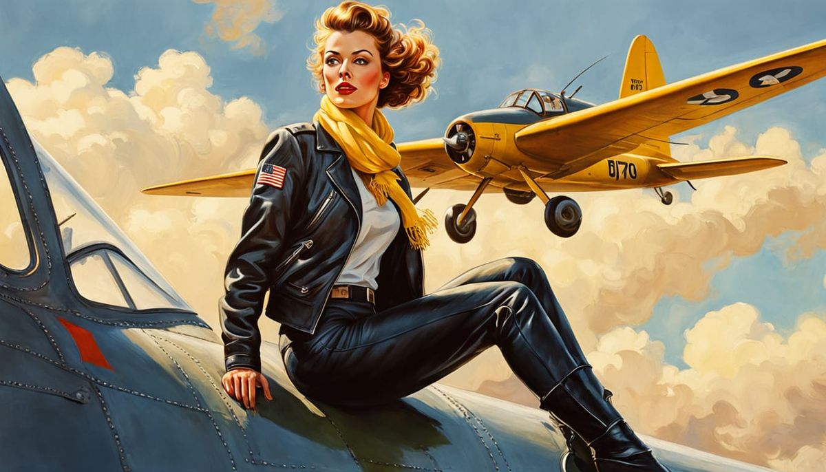 A vintage-style pin-up of a female warbird pilot posed on an aircraft wing. The artwork evokes a nostalgic, heroic mood through warm colors and soft brushstrokes reminiscent of classic oil paintings.