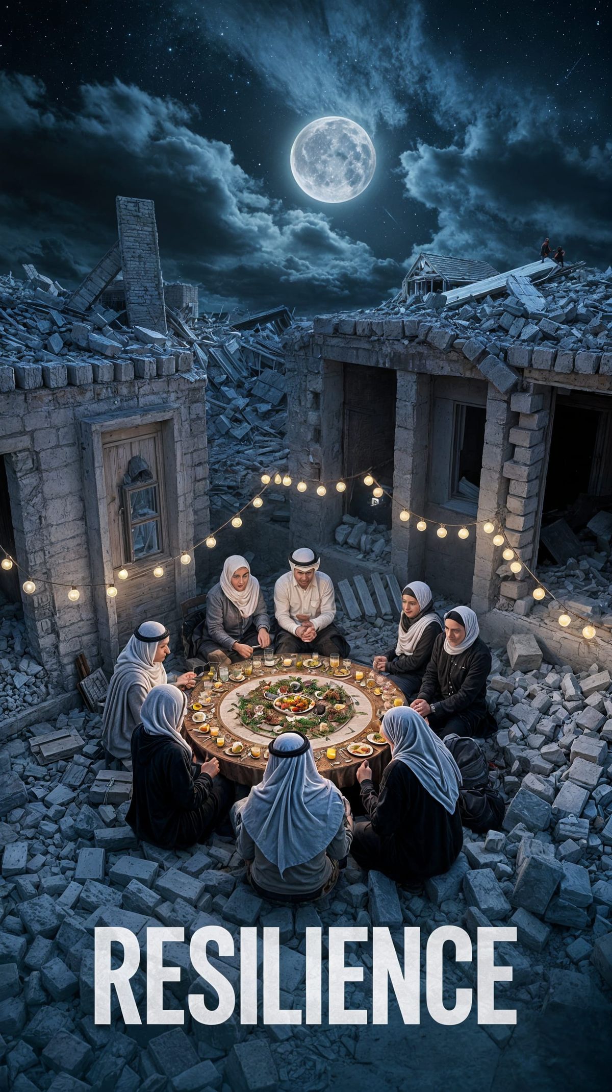This image depicts a vibrant scene of Palestinian people coming together to celebrate Ramadan, amidst the ruins of destroyed buildings, under a dramatic cosmic night sky.
