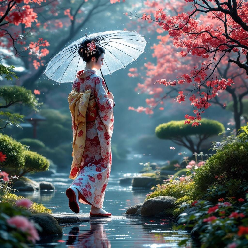 This image shows a cyber geisha in traditional kimono walking across a Japanese garden with a hi-tech umbrella. The image has a cyberpunk aesthetic.