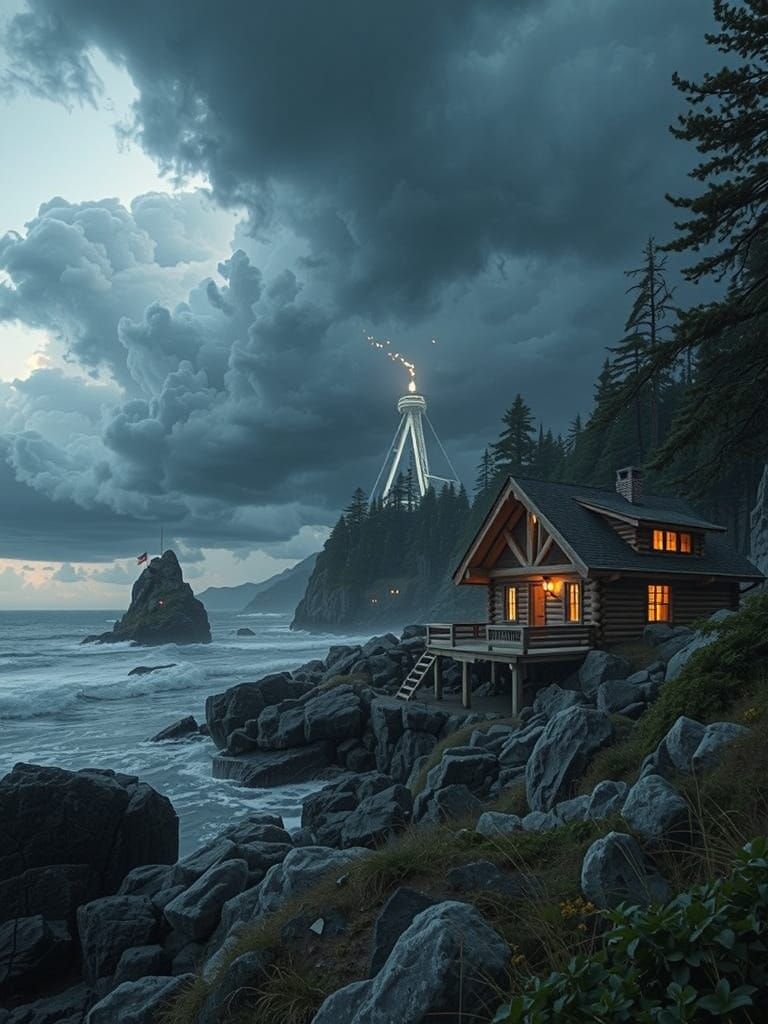 This image shows a tranquil woman before a log cabin as ocean waves crash around her. The scene evokes a blend of whimsical, detailed art with dramatic landscapes, using warm and cozy colors.