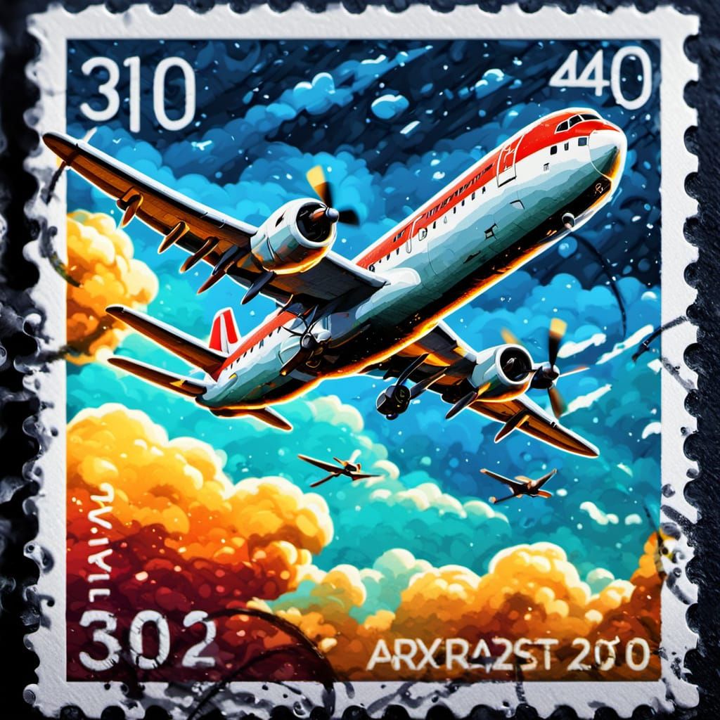 This image shows a vibrant, close-up digital artwork of a postage stamp featuring a plane in flight. Rendered in a glossy, Disney-esque style with detailed textures and warm lighting. A collectible design.