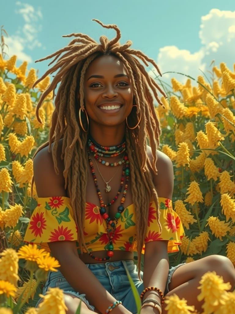 This image features a joyful, smiling African American woman with dreadlocks sitting in a field of yellow wildflowers. She wears bohemian jewelry and a floral crop top, bathed in soft, natural light.