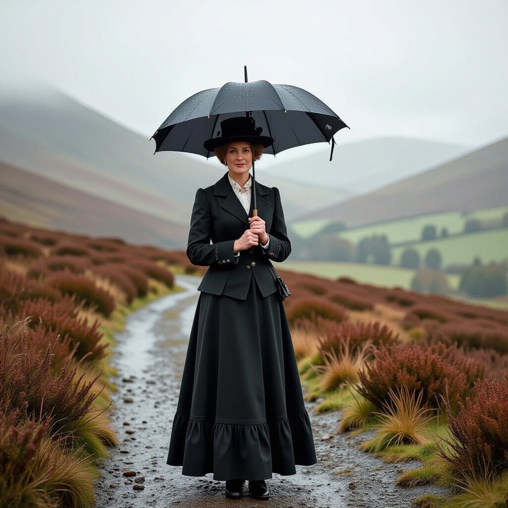 This image shows Emmeline Pankhurst in the Scottish Highlands on a rainy day. The artwork evokes a vintage photograph with a quirky painting aesthetic.