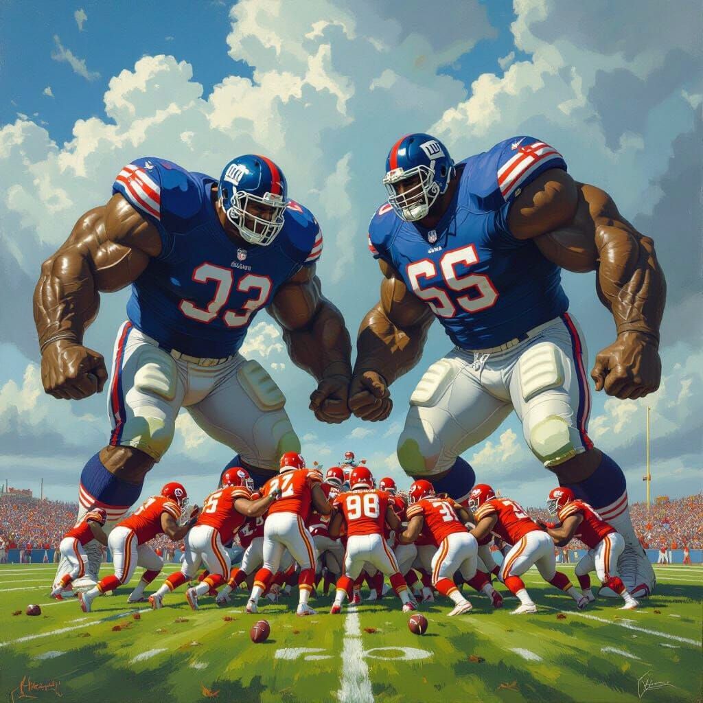 This fantasy oil painting depicts massive giants in New York Giants uniforms playfully overwhelming miniature Kansas City Chiefs on a football field. Dramatic lighting and rich colors emphasize the epic scale.
