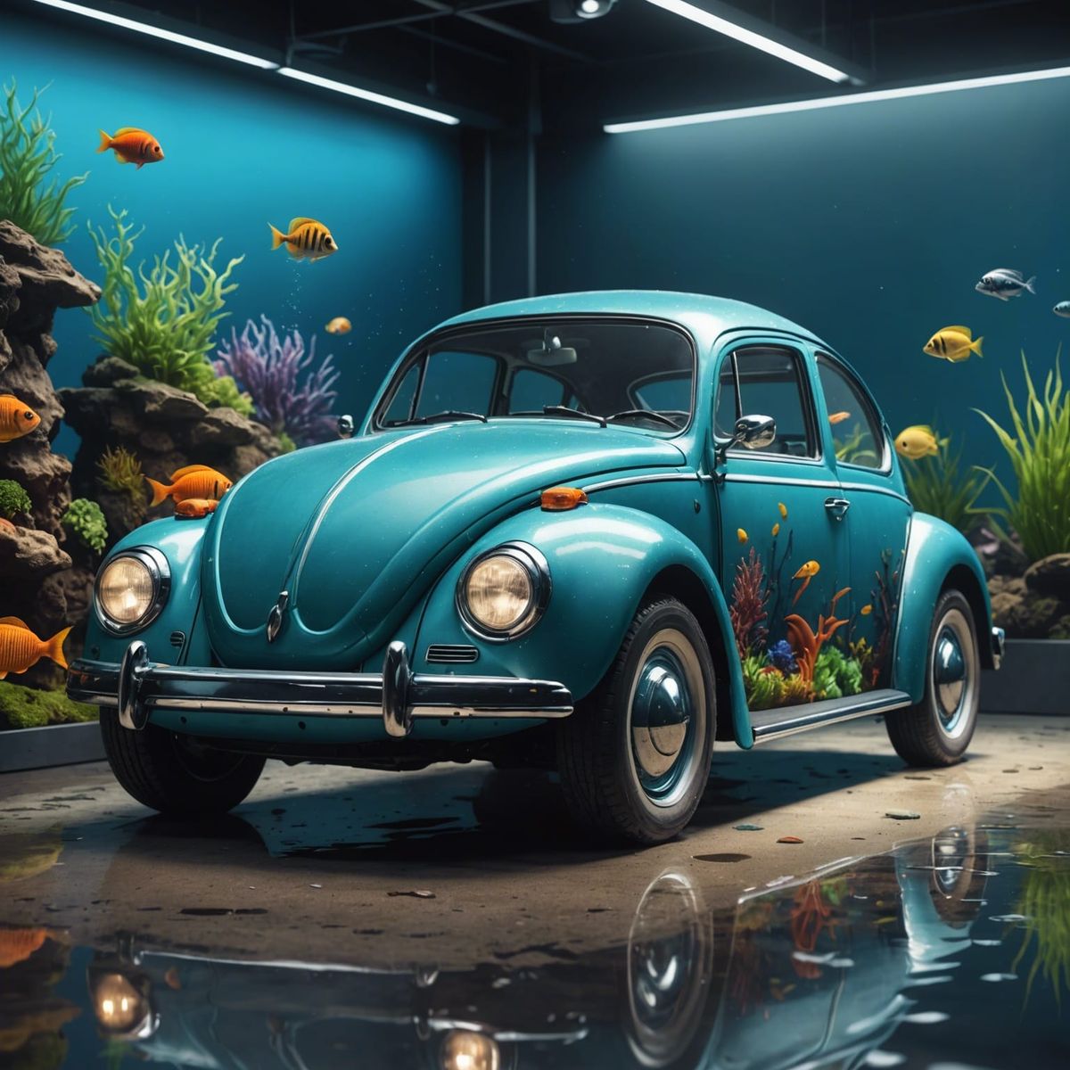 A hyperrealistic splash art image of an aquarium shaped like a Volkswagen Beetle. The mid shot captures intricate details with dramatic color depth and side lighting against a colorful backdrop.