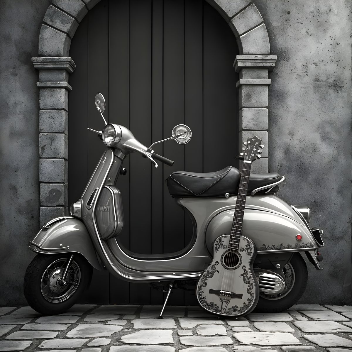 This image features a vintage Vespa scooter and a Spanish guitar against an old European wall, rendered in a detailed, monochromatic gothic art style with filigree accents and a matte background.