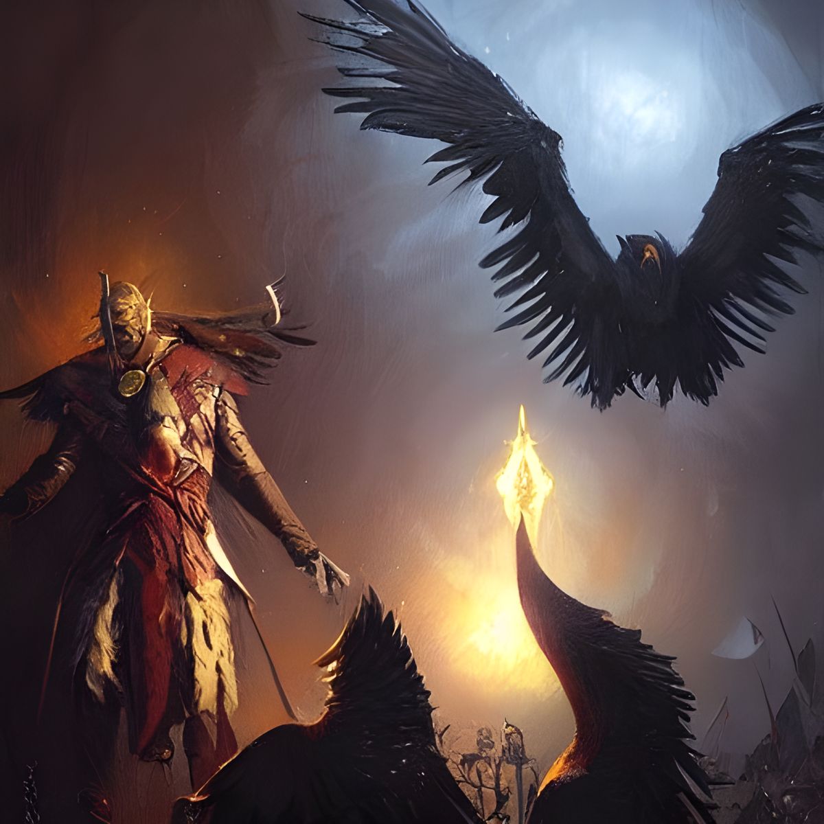 This image depicts a warrior receiving power from Odin's ravens in a dark, dramatic scene. The artwork features a sinister style, reminiscent of dark fantasy art.