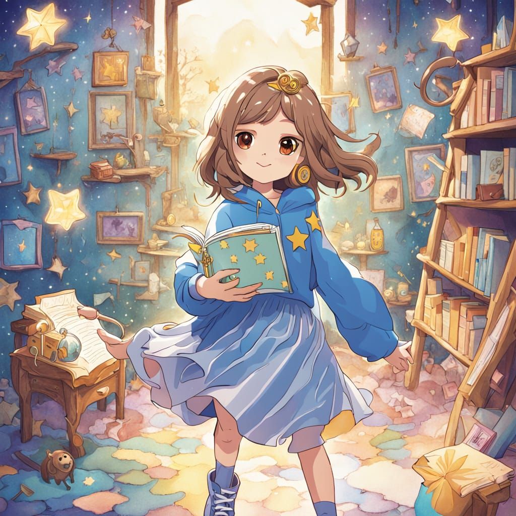 This image shows a confident 10-year-old girl named Júlia walking into a dreamy future landscape. She is holding a glowing notebook, with a whimsical sky and illustrations behind her, in a digital art style.