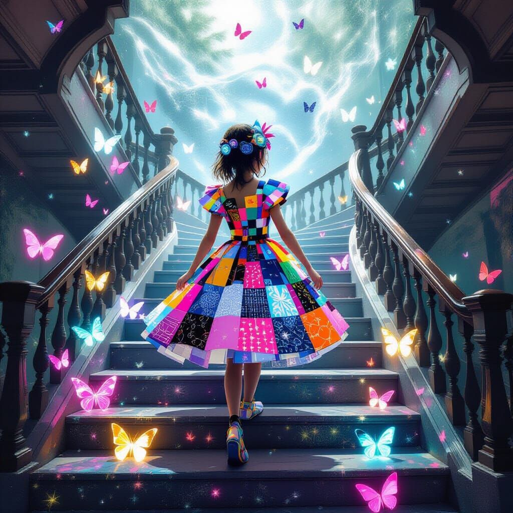 A cyborg girl in a vivid patchwork dress ascends Escher-inspired infinite stairs, surrounded by glowing butterflies and a cosmic aura.