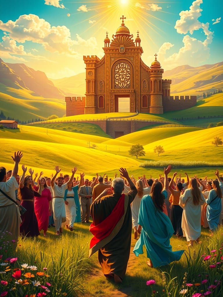 This image depicts a vibrant, idyllic scene of diverse people gathering in a grand procession, approaching a majestic palace, surrounded by wildflowers and gentle chimes, evoking a sense of devotion and thanksgiving, in a style reminiscent of Marc Chagall, Vincent van Gogh, and William Blake