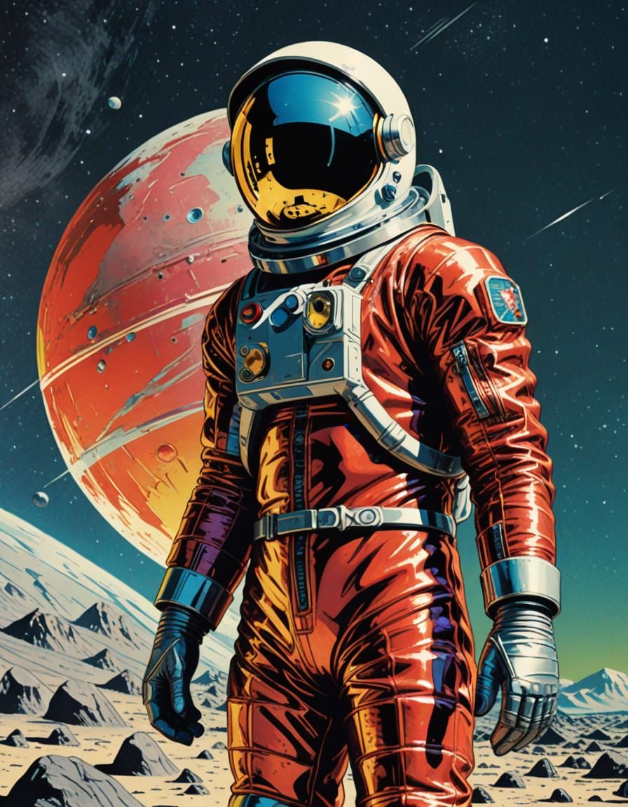A nostalgic painting of a 1950s astronaut in a colorful, comic book-inspired costume, set against a vibrant, metallic backdrop, evoking the classic sci-fi spirit of vintage comics and pulp fiction.