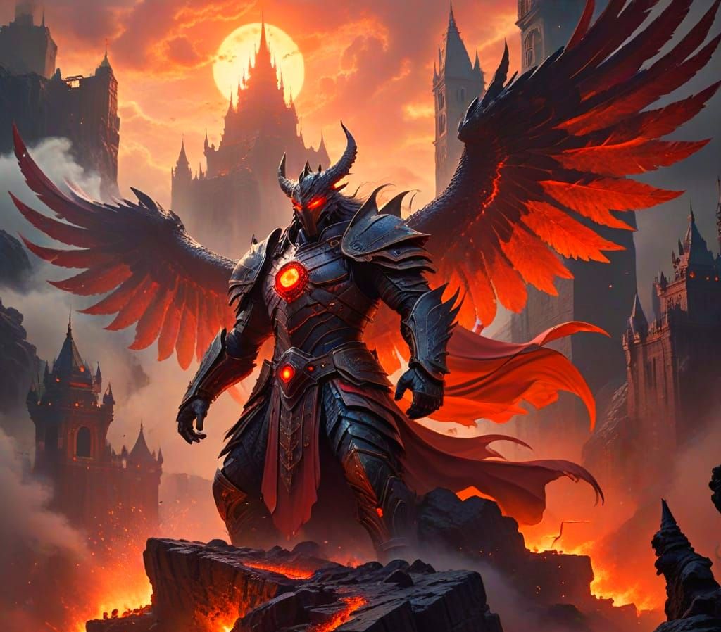This image depicts a formidable fortress of blood-red stone emerging from misty depths. Crimson skies and molten rivers highlight the powerful, mysterious scene, patrolled by winged guardians.