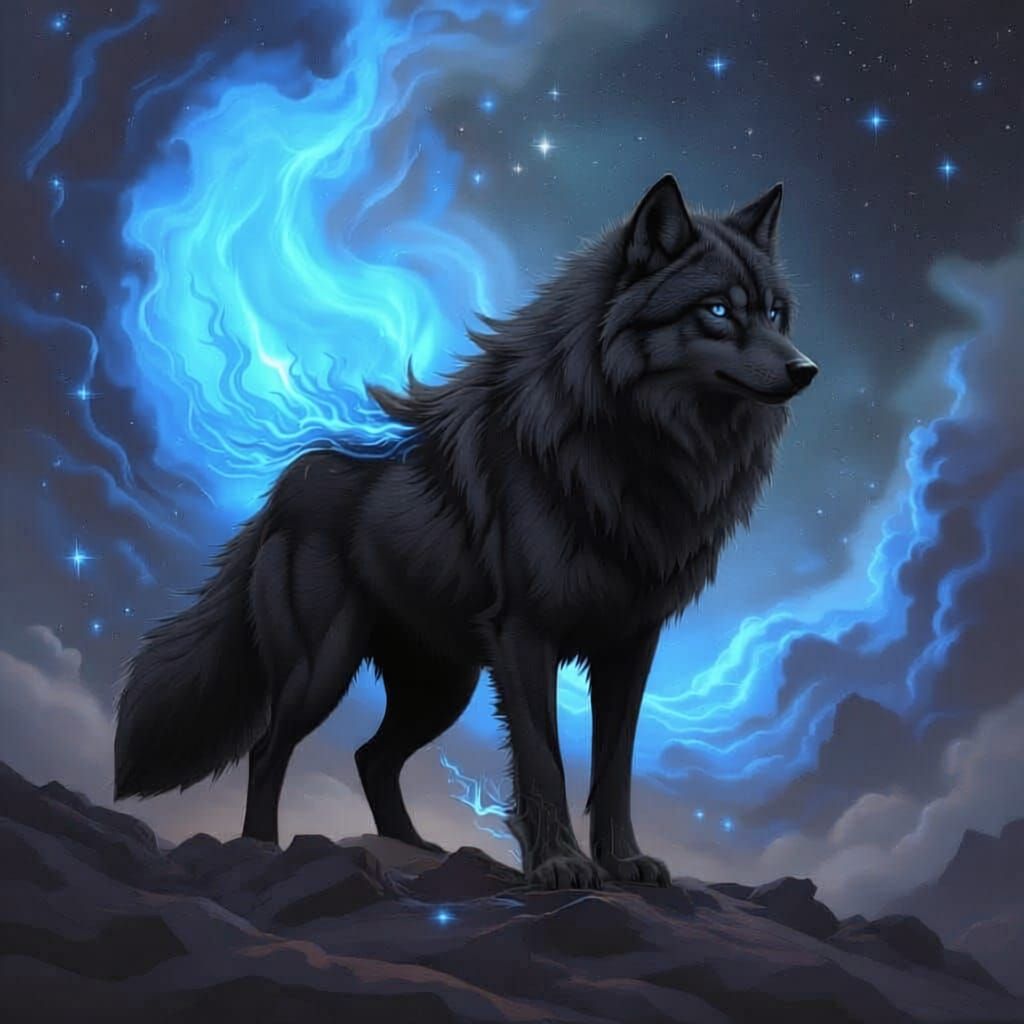 This image shows a powerful silver wolf silhouetted against a swirling nebula. Cosmic energy, black flames, and glowing runes enhance its majestic form in a maximalist, detailed style.