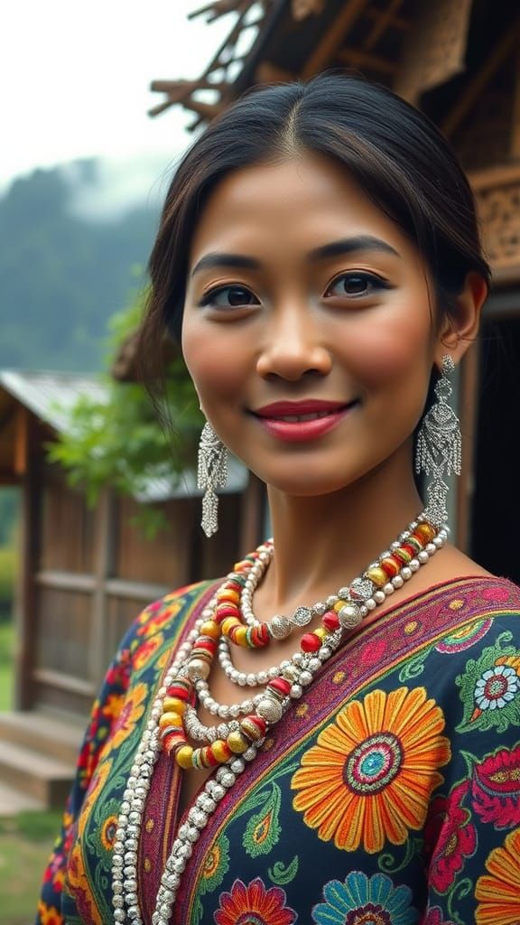 A stunning image of a beautiful woman in a vibrant Baro't Saya, surrounded by traditional Ifugao hut and lush mountain landscape, with intricate details and textures reminiscent of Filipino art and culture.