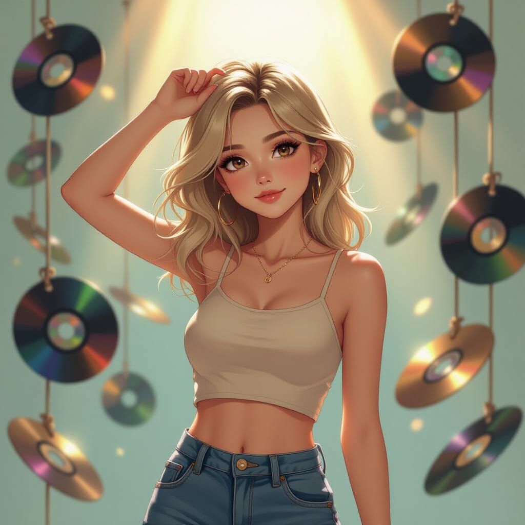 A digital painting of a blonde-haired girl with shining brown eyes, wearing casual clothes, posed among CDs reflecting sunlight. The image is rendered with dreamy colors and subtle textures.