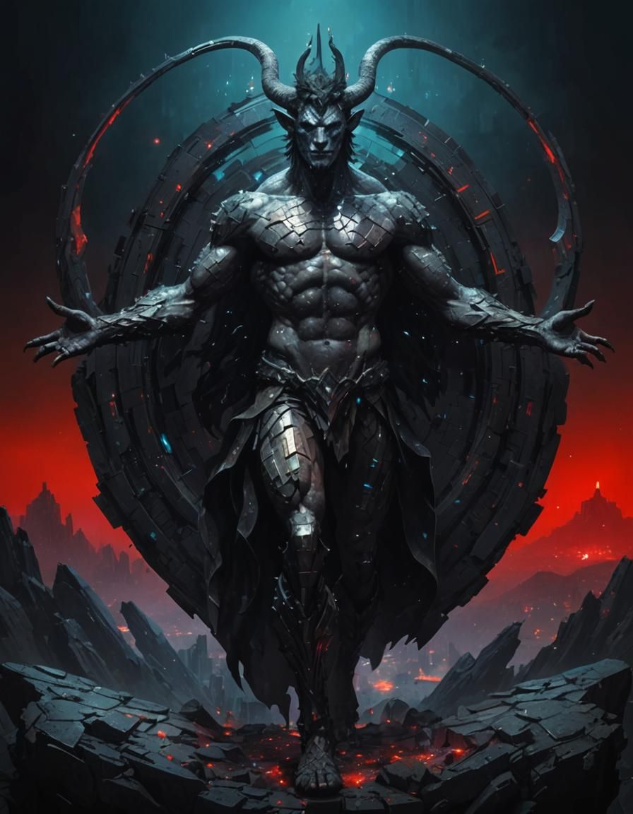 This image shows a shirtless satyr in pixelated neofuturistic armor against a surreal backdrop. The artwork is a maximalist digital painting in red and dark gray, with abstract and geometric elements.