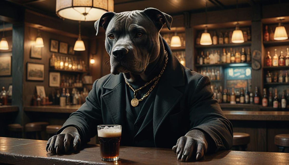 This image features a dark gray American pitbull sitting on a bar stool, wearing a black overcoat and holding a pint of dark beer, set against a cinematic backdrop with film grain and vignette effects