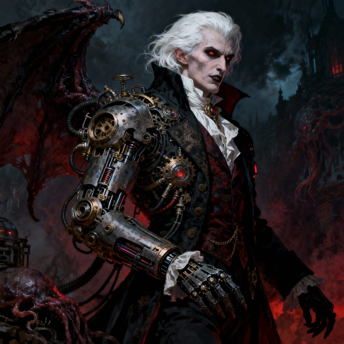 A detailed sci-fi illustration of a white-haired vampire from the 19th century, featuring intricate mechanical enhancements and dramatic lighting. Inspired by dark fantasy and surreal art.
