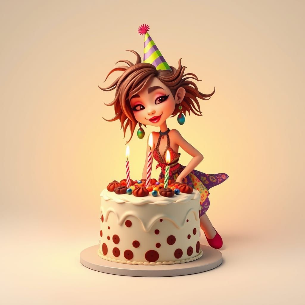 This colorful, 3D caricature of a free-spirited bohemian girl blows out candles on a decadent birthday cake, surrounded by a warm, golden glow, in a style reminiscent of fantastical, dreamlike artwork with bold, tubular shapes and smooth, rounded lines.