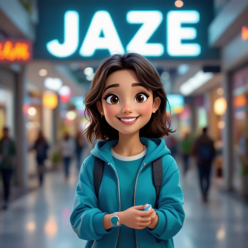 This digital drawing features a smiling, big-eyed character with sharp lines and neon "Jaze" accents. It holds a game controller against a soft gradient background with bright lighting and vivid colors.