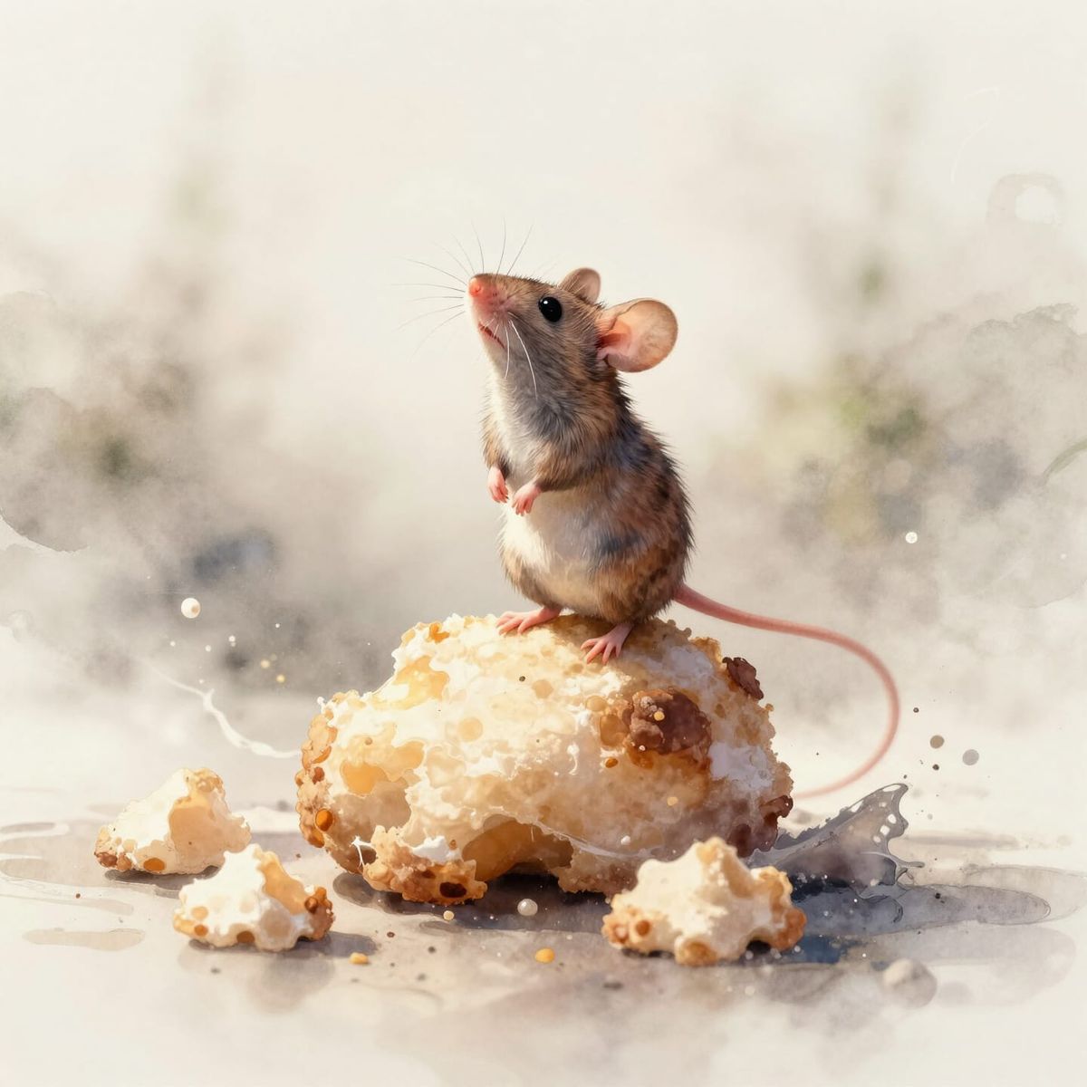 A tiny mouse proudly standing atop a crumb twice its size, chest lifted in quiet triumph. The world around it feels vast and overwhelming, yet this small victory feels monumental. Soft natural light, shallow depth of field, warm tones, whimsical realism, gentle storytelling mood. blends Willem Haenraets ...