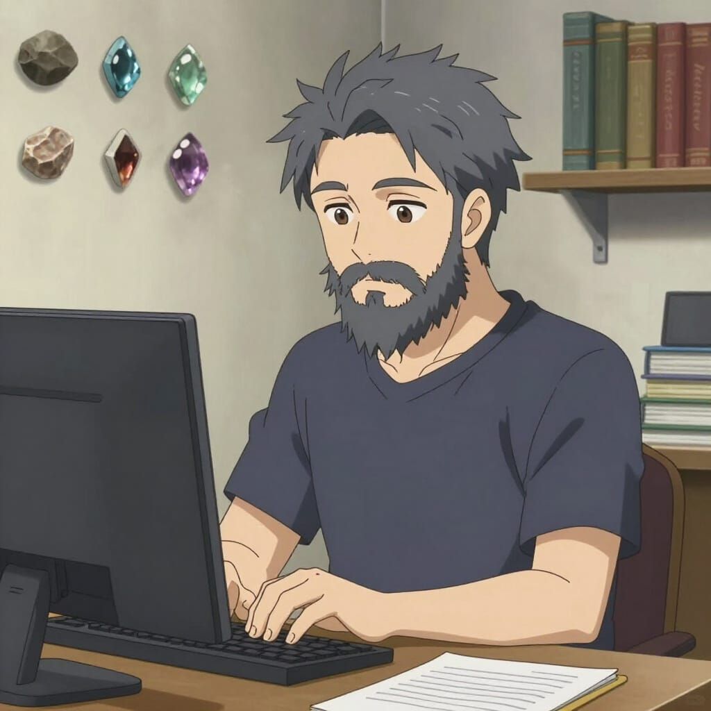 This image shows a bearded man with gray hair working on a computer in his office. The walls are decorated with rocks and gemstones, and books and notepads are scattered around.