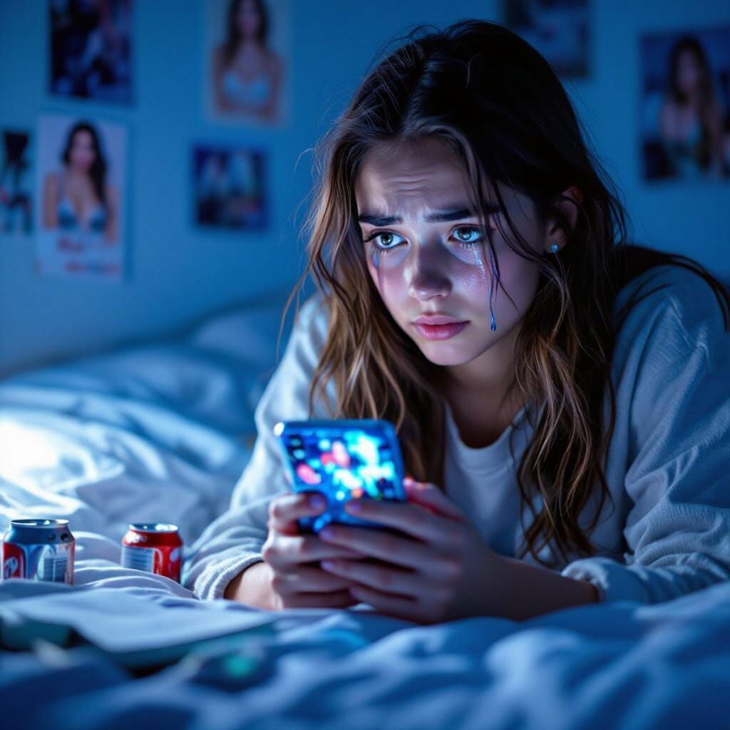 This hyperrealistic image captures a teenage girl's bedroom at 2 AM, lit by her phone. Her face, wet with tears, is softly focused, highlighting her tired eyes.
