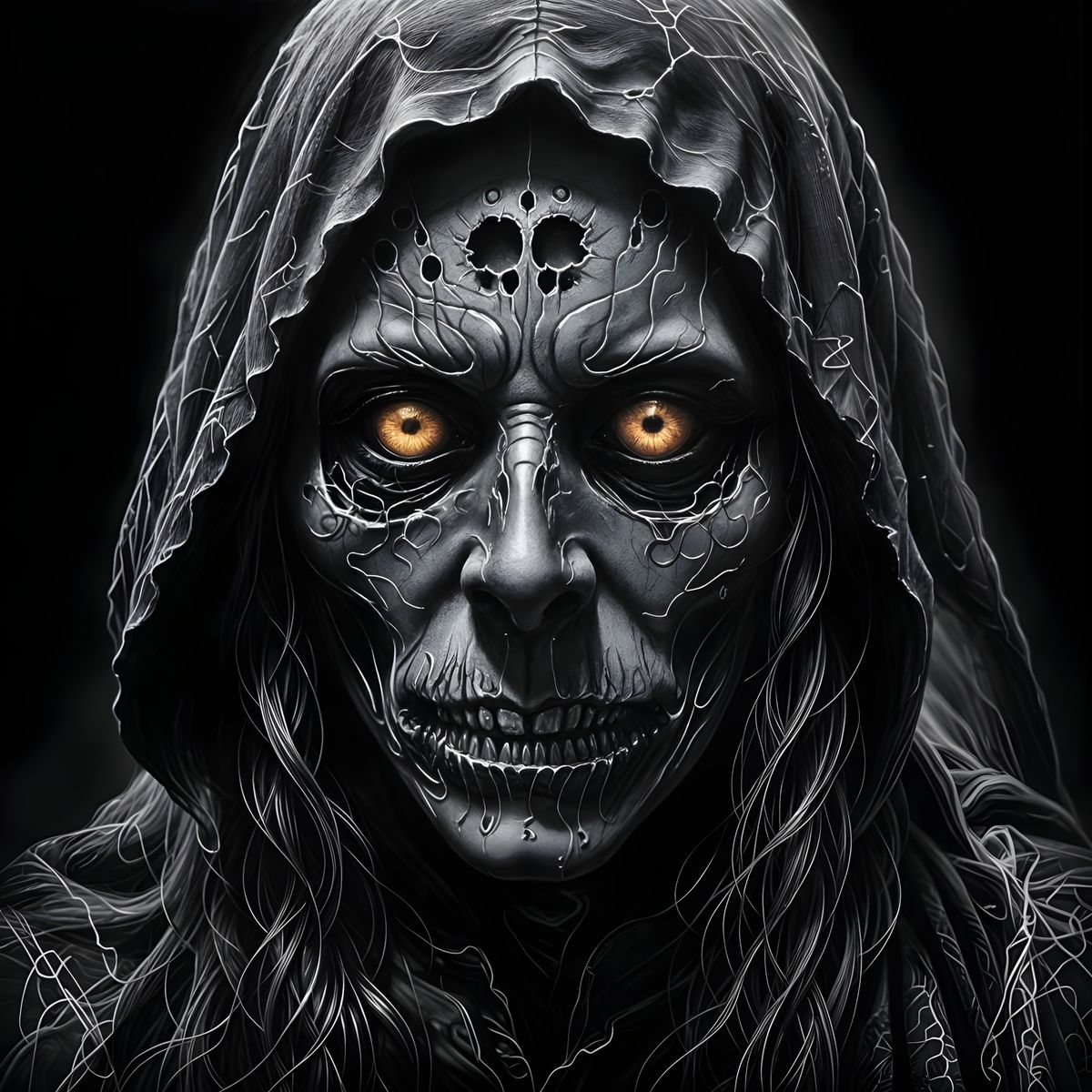 This image shows a haunting, detailed mask that seems to glow with an otherworldly light, as if it could transport the wearer into a realm of eerie beauty.