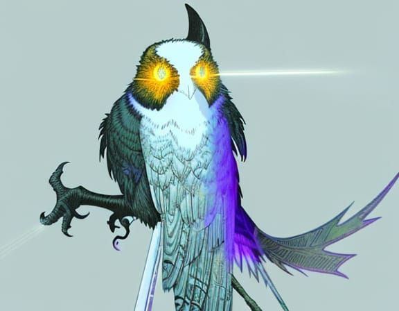 A close-up image of a person emitting laser beams from their eyes. The image features glowing purple eyes set against a dark yellow background in a dark fantasy style. The image is highly detailed.