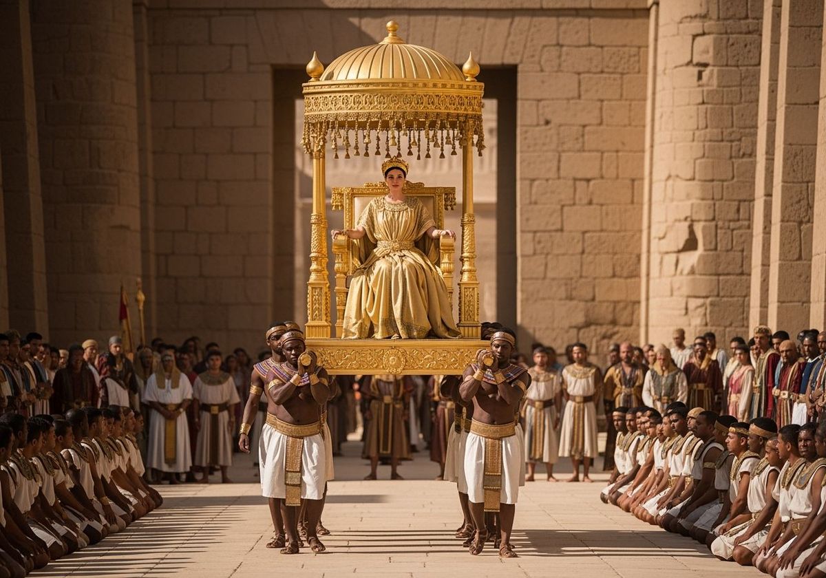 This image shows a Roman Empress in a gold toga, carried on a golden throne by servants through Ancient Egypt. Shot with professional photography techniques and natural lighting.