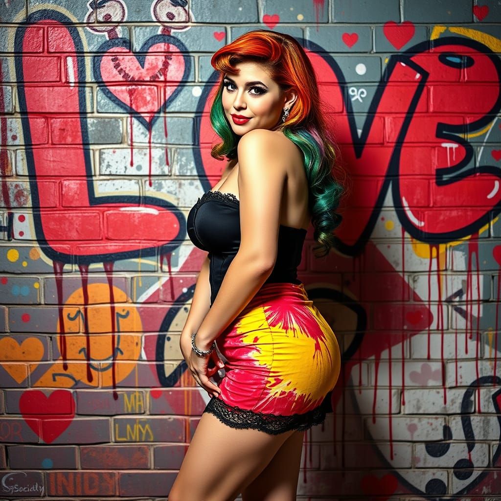 A full body image of a 1950s plump pin-up woman with rainbow hair, wearing a corset and tie-dyed skirt. The background features vibrant, high-contrast graffiti art.