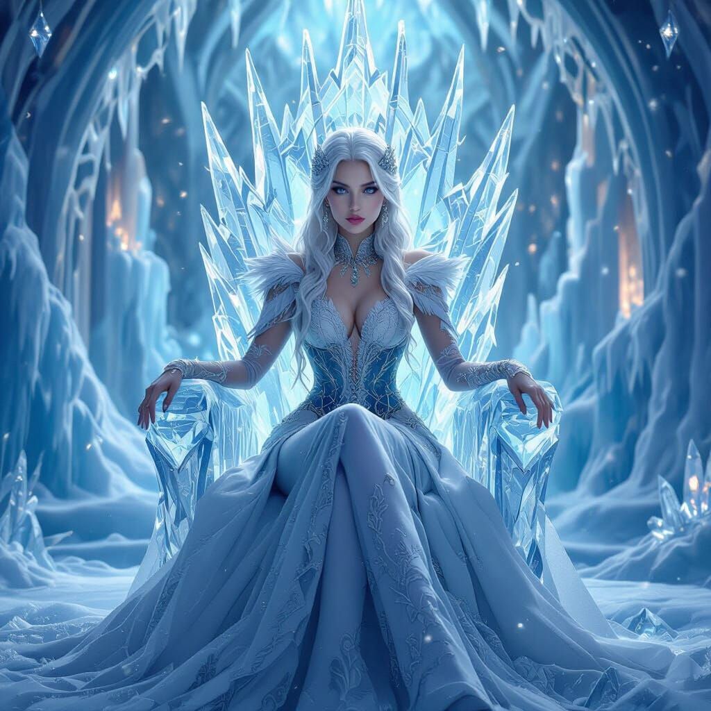 A hyperrealistic digital rendering of an ice queen on a throne of ice. She has silver hair, blue eyes and wears an ornate gown, surrounded by snowflakes. The artwork features organic curves and atmospheric lighting.
